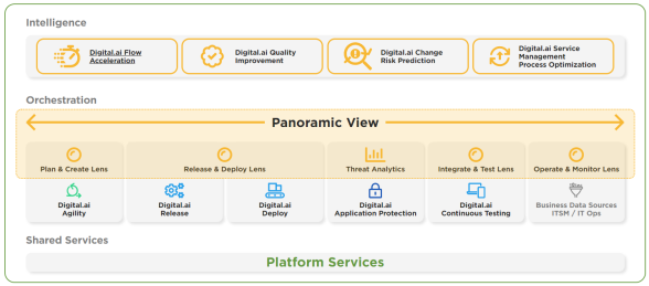 The Digital.ai Intelligence Applications platform blends data from a variety of value stream tools used for Agile planning, DevOps, Application Security, and Application Lifecycle Management and provides easy to use analytical insights that help IT organizations accelerate service delivery, reduce risks, and prevent service disruptions.