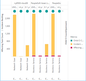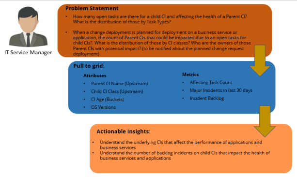 Through the iCubes or dossiers, Andrew can get insights into the number of underlying CIs associated with a business service, such as servers, databases and their age buckets, OS versions, count of affecting tasks, Incident backlog, and so on. Also, Andrew can see what are the Incident backlogs and open tasks for the child CIs greater than 30 days which might impact the performance.